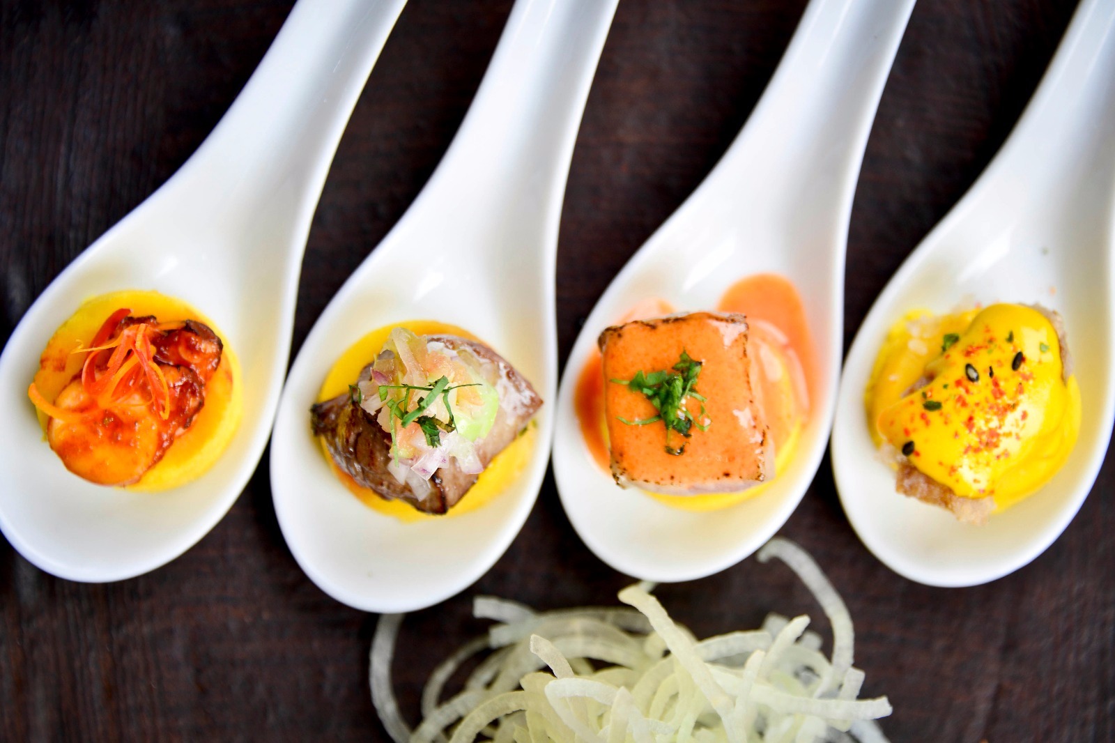 Ojo, que también hay excelentes picoteos para comenzar, como los Nems ($ 6.900), seis arrollados de masa de arroz frita rellenos de camarones y verduras salteadas al curry, envueltos en hojas de lechuga. Crujientes y sabrosos, el toque de hojas de menta les da un estupendo frescor. Las Pinzas Panko ($ 6.900) también son una gran opción –cinco unidades de crujientes e intensas pinzas de fritura perfecta que entremezclan camarón, jaiba y ají panca–, al igual que el precioso cuarteto de Mini causitas ($7.200) de camarón, pulpo, carne y atún.