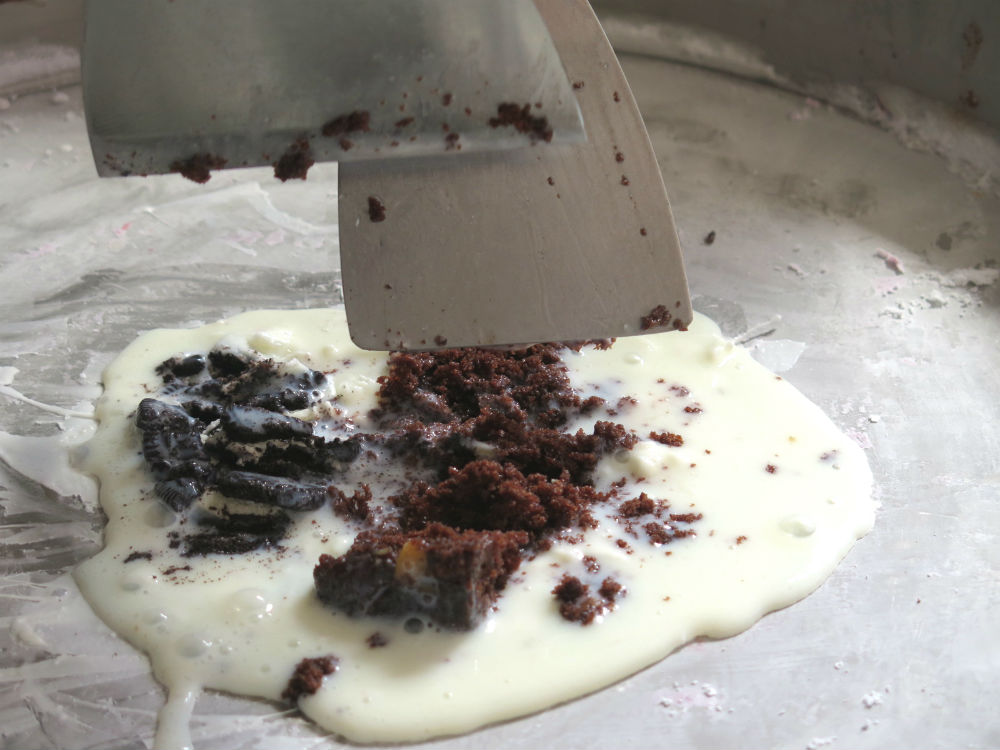 El sistema funciona así: por $ 2.200 eliges dos sabores, los mezclan en una plancha junto a una crema líquida hasta que se congelan y forman unos mini rollos de helados que ponen sobre un vaso o cono de helado.