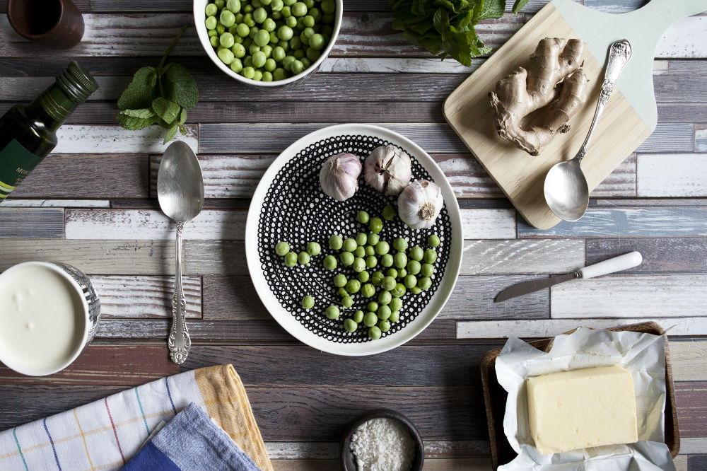 Cocina por cinco o seis minutos las arvejas hasta que estén tiernas. Una vez cocidas, retíralas, guardando aparte el agua de la cocción. En la misma olla, derrite la mantequilla junto a un chorrito de aceite de oliva extra virgen y dora las arvejas junto con el ajo por dos minutos. Agrega la crema y cocina todo por dos minutos más, sin dejar que hierva. Apaga el fuego, agrega el jengibre fresco, una taza de agua de la cocción, las hojas de menta y procesa todo en una juguera o con una minipymer hasta conseguir una crema homogénea. Si quieres una mezcla más compacta para acompañar con tostadas o bruschettas, tipo hummus, sólo debes echar menos agua de la cocción a la mezcla.