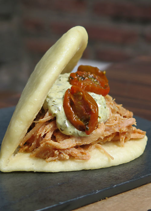 ¿Qué puedes probar? Primero, cualquiera de sus baos, elaborados cada mañana con harina importada desde Corea. Todos cuestan $2.500 y hay cinco para elegir, incluyendo opciones vegetarianas, entre los que hay dos que sacan aplausos: el de Pulled pork, con delicioso y levemente dulce chanchito deshilachado, mayonesa picante en base a jalapeño y tomates cherry asados; y el de osobuco, suave y sabroso, acompañado de una sabrosa salsa bearnesa en base a huevo y estragón.