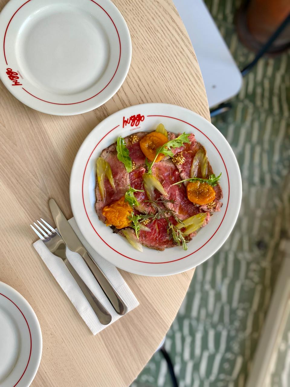 La carta de Huggo Comedor funciona desde el desayuno hasta la once y va cambiando de acuerdo a la estación: Sándwich de churrasca con lengua y queso mantecoso ($7.800), una reversión del clásico Barros Luco; Bondiola ($11.300), que incluye lomo de cerdo braseado con vino blanco y duraznos, y Tártaro de pescado ($9.800), con pesca del día sobre un crujiente rosti de papa camote; entre otras opciones.