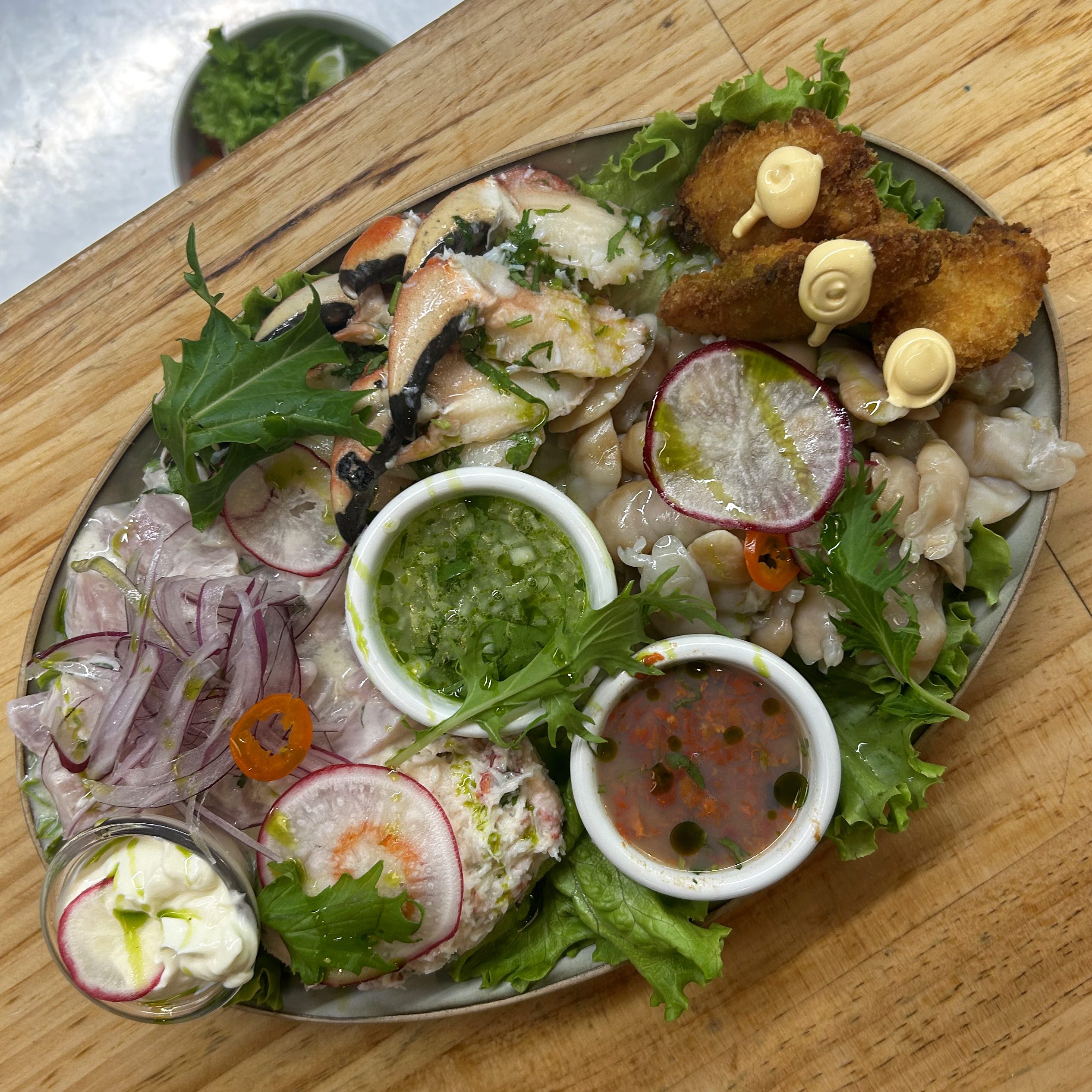 La forma más fácil de comer la diversidad del Pacífico chileno en un solo bocado. Por eso, el plato homónimo de La Calma se ha convertido en un clásico de este comedor marino de Vitacura. Son al menos 730 gramos de los mejores pescados, mariscos, algas y crustáceos disponibles ese día. Locos y lapas de Coquimbo, chochas de Puerto Aldea, piures de Maullín, huepos de Niebla, ostras de Calbuco, pulpo de Antofagasta, erizos de Atacama –solo en temporada– y más, dispuestos sobre un gran plato con hielo, prácticamente sin intervención: crudos, con un toque de vinagre o con una pizca de salsa verde y mayonesa casera. Un revolcón marino en formato gastro.